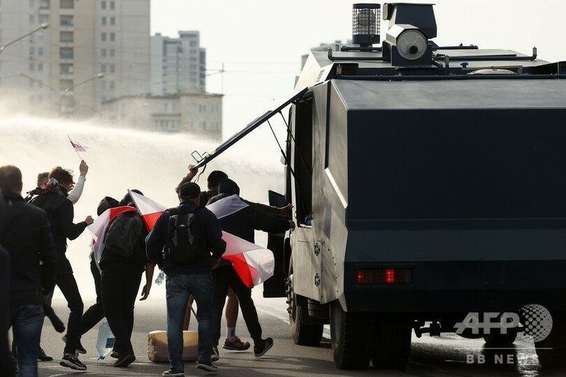 【10月5日 AFP】ベラルーシ首都ミンスクで4日、拘束されている反政権派活動家らの解放を求めるデモが行われ、数万人が参加した。警察は参加者らを解散させるため、放水砲を使用した。