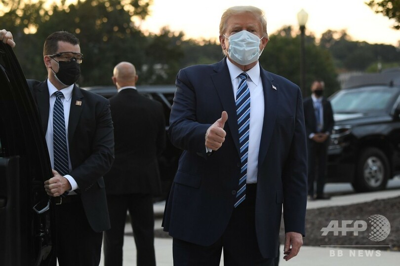トランプ氏はマスクを着けて退院。車に乗り込む際には親指を立てて見せた。ヘリコプターに乗り換えてホワイトハウスに到着すると、マスクを外してあいさつした。今後はホワイトハウスで治療を続けるという。