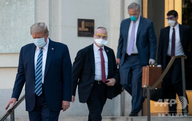 トランプ氏はマスクを着けて退院。車に乗り込む際には親指を立てて見せた。ヘリコプターに乗り換えてホワイトハウスに到着すると、マスクを外してあいさつした。今後はホワイトハウスで治療を続けるという。