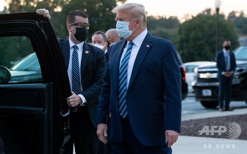 トランプ氏はマスクを着けて退院。車に乗り込む際には親指を立てて見せた。ヘリコプターに乗り換えてホワイトハウスに到着すると、マスクを外してあいさつした。今後はホワイトハウスで治療を続けるという。