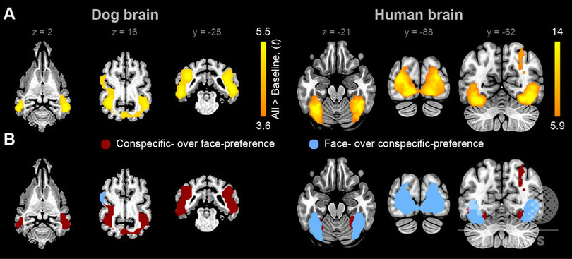 一方、犬の脳では、顔に対してより強く反応する部位はないが、一部の部位は人の映像より犬の映像の方により強い反応を示した。