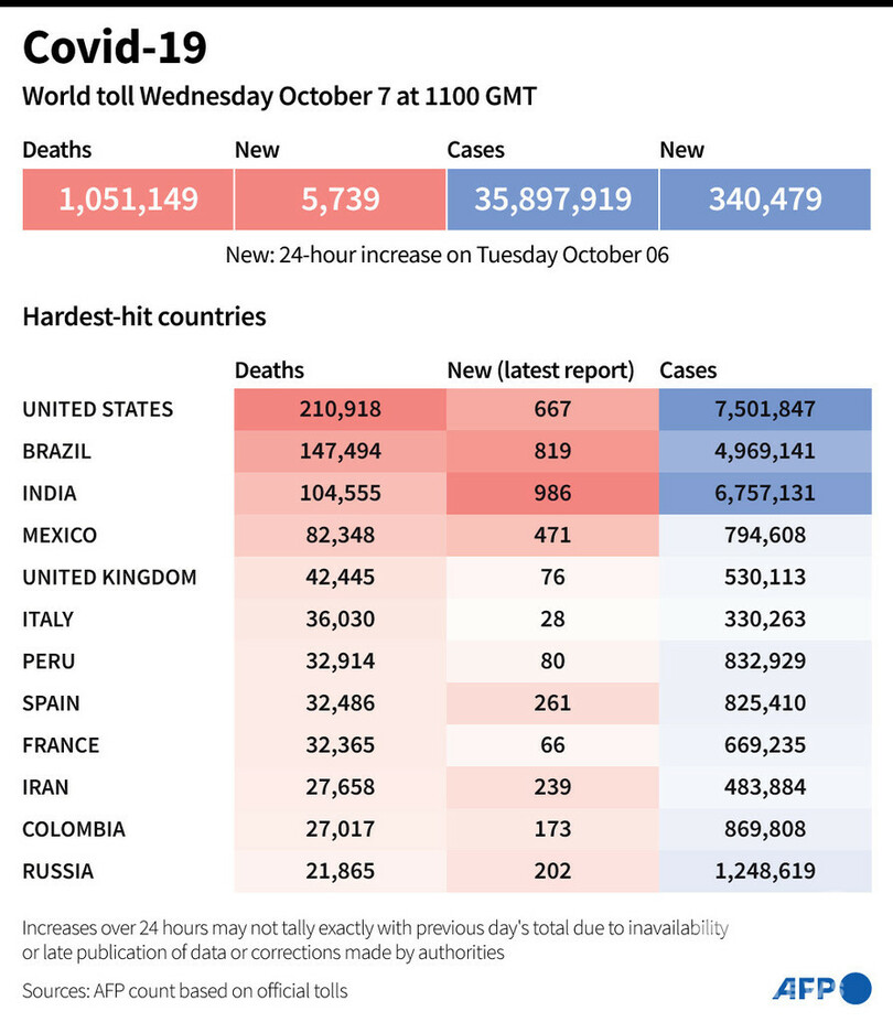 【10月8日 AFP】AFPが各国当局の発表に基づき日本時間7日午後8時にまとめた統計によると、世界の新型コロナウイルスによる死者数は105万1149人に増加した。