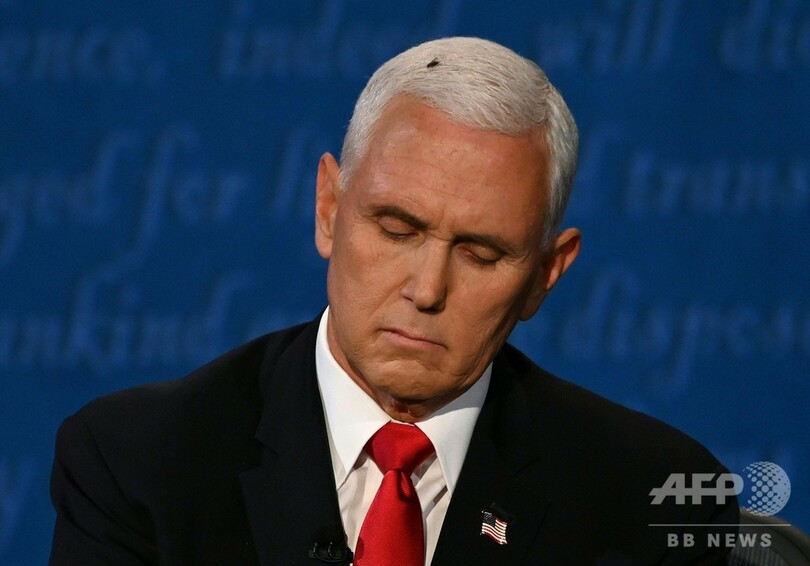 討論会ではペンス氏の頭にハエが止まる一幕もあった。壇上では誰もその点に触れることはなかったが、ソーシャルメディア上ではハエをめぐる投稿が殺到した。(c)AFP