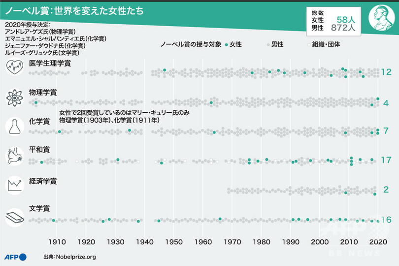 【10月8日 AFP】(更新)歴代のノーベル賞(Nobel Prize)受賞者は圧倒的に男性が多いが、2020年はこれまでに、米国のアンドレア・ゲズ(Andrea Ghez)氏に物理学賞、フランスのエマニュエル・シャルパンティエ(Emmanuelle Charpentier)、米国のジェニファー・ダウドナ(Jennifer Doudna)両氏に化学賞、米国のルイーズ・グリュック氏に文学賞が授与されることが決まった。図に、男性、女性、組織・団体別のノーベル賞受賞状況をまとめた。(c)AFP
