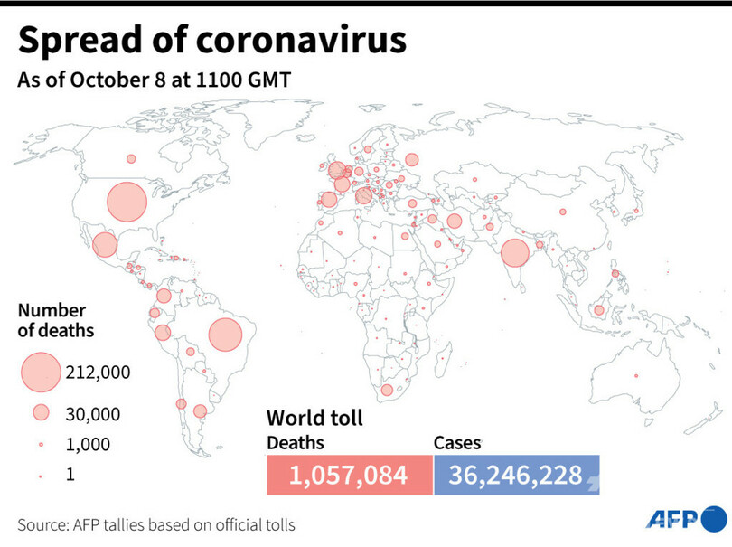 【10月9日 AFP】AFPが各国当局の発表に基づき日本時間8日午後8時にまとめた統計によると、世界の新型コロナウイルスによる死者数は105万7084人に増加した。
