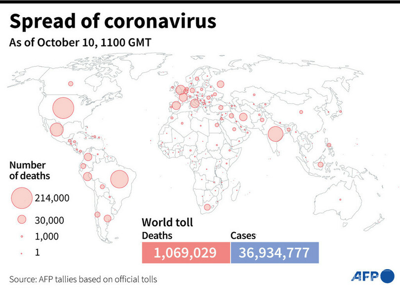 【10月11日 AFP】AFPが各国当局の発表に基づき日本時間10日午後8時にまとめた統計によると、世界の新型コロナウイルスによる死者数は106万9029人に増加した。