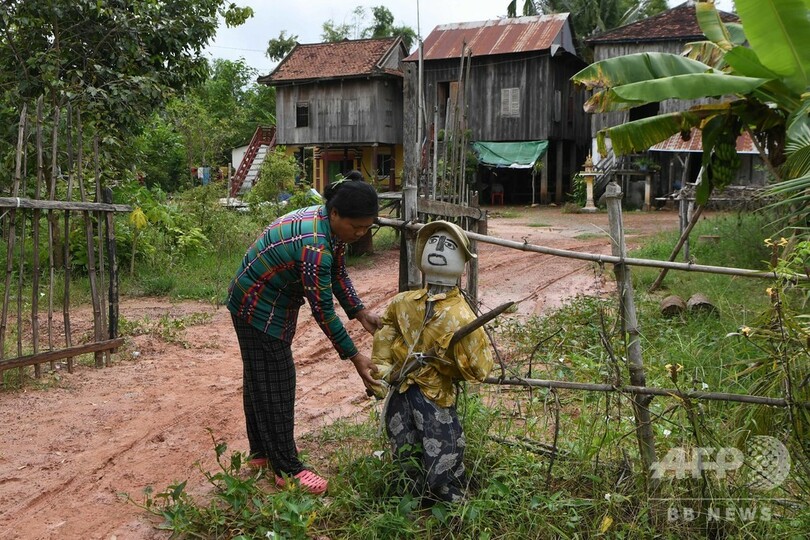 同国首都プノンペンの北東約110キロに位置するコンポンチャム(Kampong Cham)州に住む農家のソック・チャニー(Sok Chany)さん(45)は、今回、「コロナウイルスに家族が脅かされるのを防ぐためにティン・モンを立てた」と話す。チャニーさんが暮らす木造の高床式住宅の前には2体のかかしが立っている。
