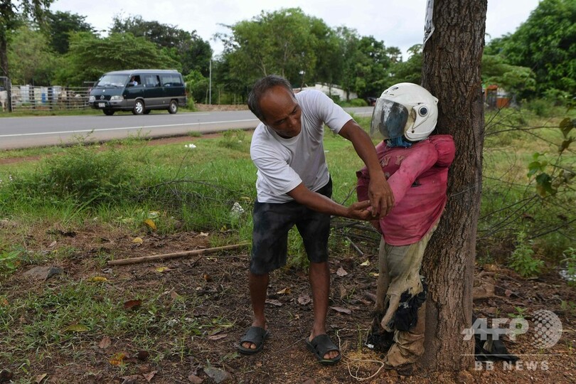 【10月12日 AFP】カンボジアの農村部に立つ一軒の家の前に、頭にプラスチックの鉢をかぶり、木の枝で武装し花柄のシャツを着たかかしが立っている。縁起を担ぐ農家の住人が立てた、新型コロナウイルスを追い払うための見張り役だ。