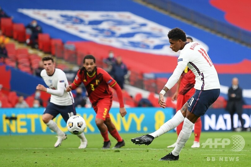 イングランドはベルギーに逆転勝利でグループ2首位に浮上した。世界ランキング1位のベルギーは序盤にロメルー・ルカク(Romelu Lukaku)のPKで先制したが、イングランドはマーカス・ラシュフォード(Marcus Rashford)のPKで追いつくと、65分にメイソン・マウント(Mason Mount)のシュートが相手に当たってゴールに吸い込まれた。(c)AFP/Terry DALEY