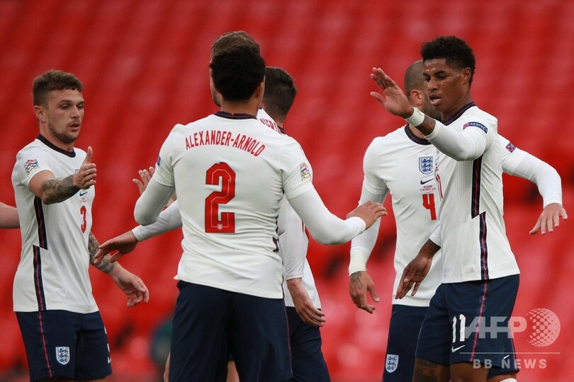 イングランドはベルギーに逆転勝利でグループ2首位に浮上した。世界ランキング1位のベルギーは序盤にロメルー・ルカク(Romelu Lukaku)のPKで先制したが、イングランドはマーカス・ラシュフォード(Marcus Rashford)のPKで追いつくと、65分にメイソン・マウント(Mason Mount)のシュートが相手に当たってゴールに吸い込まれた。(c)AFP/Terry DALEY