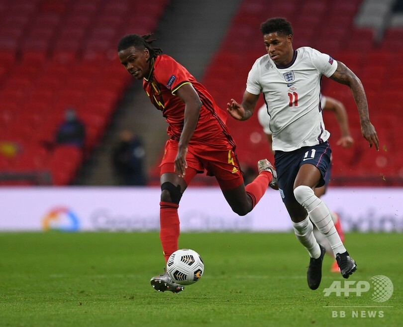 イングランドはベルギーに逆転勝利でグループ2首位に浮上した。世界ランキング1位のベルギーは序盤にロメルー・ルカク(Romelu Lukaku)のPKで先制したが、イングランドはマーカス・ラシュフォード(Marcus Rashford)のPKで追いつくと、65分にメイソン・マウント(Mason Mount)のシュートが相手に当たってゴールに吸い込まれた。(c)AFP/Terry DALEY