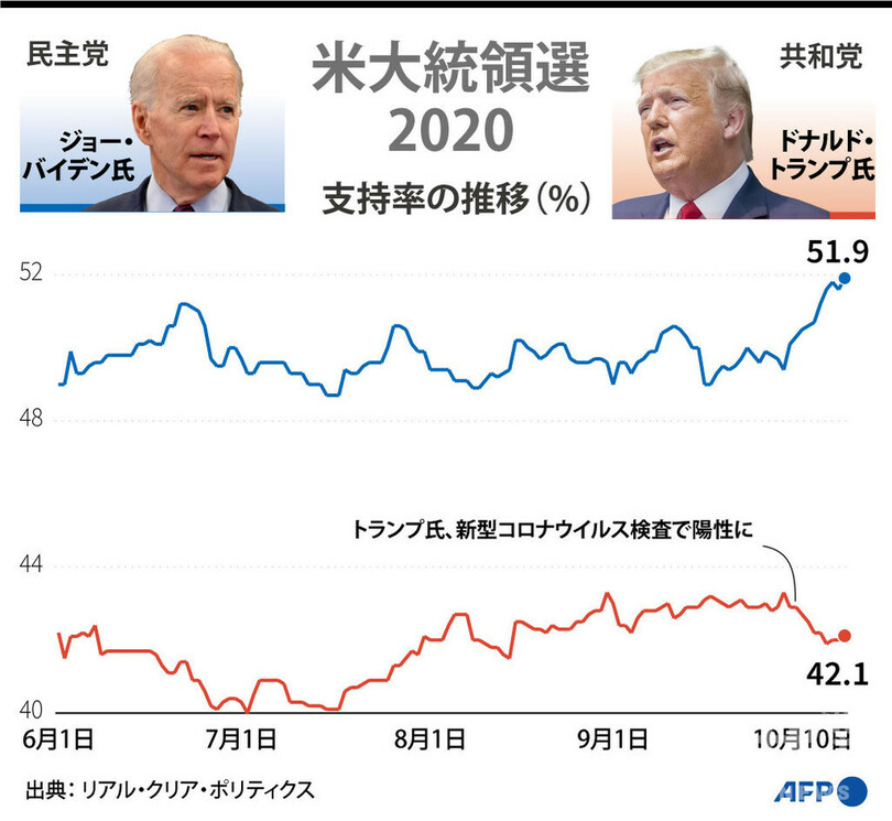 【図解】米大統領選2020 トランプ氏とバイデン氏の支持率の推移(10月10日まで)