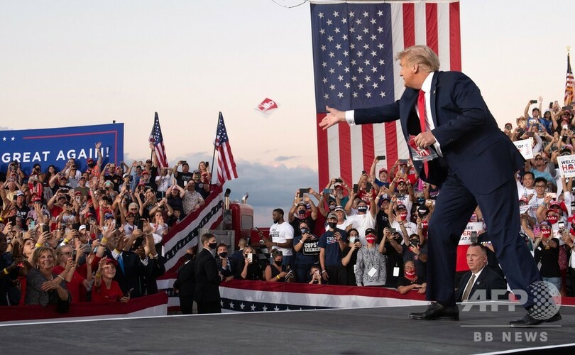 1週間前に退院したばかりのトランプ氏は、オーランド(Orlando)近郊サンフォード(Sanford)で行われた選挙集会で、1時間にわたって演説。「私は感染を体験し、今は免疫がある」「力がみなぎっている。会場の皆さんのところまで歩いて行って、全員にキスをしたいぐらいだ。男性にも、美しい女性にも、思い切りキスしたい」と語りかけた。声援を送る支持者の多くはマスクを着けていなかった。