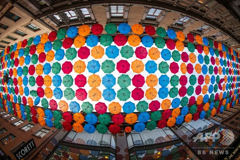 【10月21日 AFP】色とりどりの傘で商店街ドロットニンガータン(Drottninggatan)を覆うインスタレーション「アンブレラ・プロジェクト(The Umbrella Project)」。スウェーデン・ストックホルムで。