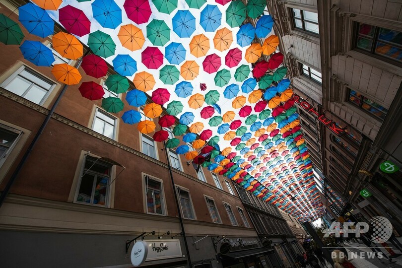 【10月21日 AFP】色とりどりの傘で商店街ドロットニンガータン(Drottninggatan)を覆うインスタレーション「アンブレラ・プロジェクト(The Umbrella Project)」。スウェーデン・ストックホルムで。