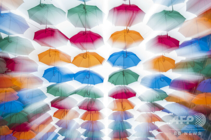 【10月21日 AFP】色とりどりの傘で商店街ドロットニンガータン(Drottninggatan)を覆うインスタレーション「アンブレラ・プロジェクト(The Umbrella Project)」。スウェーデン・ストックホルムで。