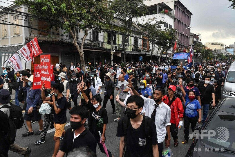 【10月15日 AFP】タイの首都バンコクで14日、プラユット・チャンオーチャー(Prayut Chan-O-Cha)首相の辞任を求めるデモが行われ、若者を中心とした数千人が首相府に向け行進した。現場では、デモ隊が要求する王室改革に反対する王室支持派との間での小競り合いも起きた。