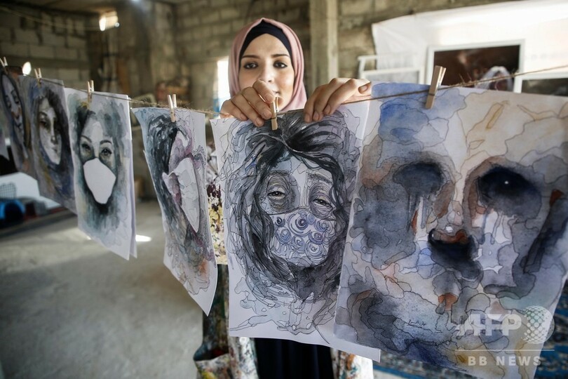 【10月22日 AFP】パレスチナ自治区ガザ地区(Gaza Strip)南部のハンユニス(Khan Yunis)で、新型コロナウイルスによる都市封鎖期間中に、自宅で描いた絵画をつり下げるアーティストのフルード・デソウキ(Khulud al-Desouki)さん。(c)AFP