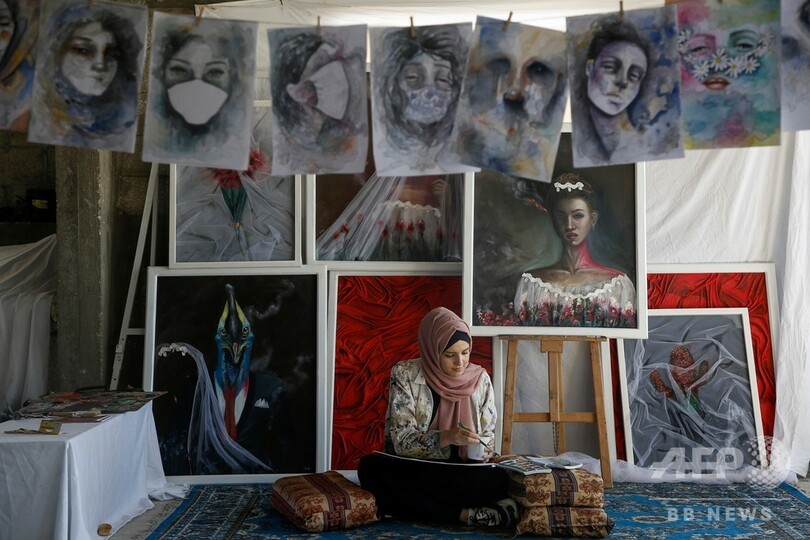 【10月22日 AFP】パレスチナ自治区ガザ地区(Gaza Strip)南部のハンユニス(Khan Yunis)で、新型コロナウイルスによる都市封鎖期間中に、自宅で描いた絵画をつり下げるアーティストのフルード・デソウキ(Khulud al-Desouki)さん。(c)AFP