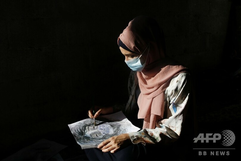 【10月22日 AFP】パレスチナ自治区ガザ地区(Gaza Strip)南部のハンユニス(Khan Yunis)で、新型コロナウイルスによる都市封鎖期間中に、自宅で描いた絵画をつり下げるアーティストのフルード・デソウキ(Khulud al-Desouki)さん。(c)AFP