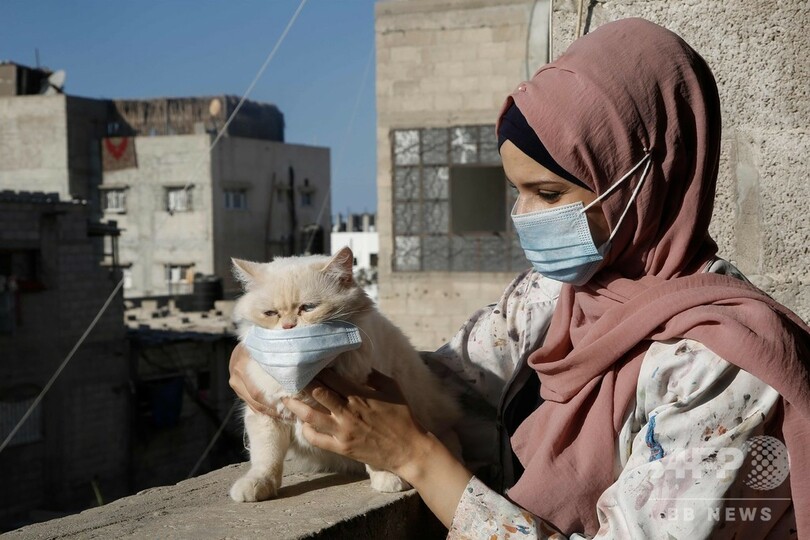 【10月22日 AFP】パレスチナ自治区ガザ地区(Gaza Strip)南部のハンユニス(Khan Yunis)で、新型コロナウイルスによる都市封鎖期間中に、自宅で描いた絵画をつり下げるアーティストのフルード・デソウキ(Khulud al-Desouki)さん。(c)AFP