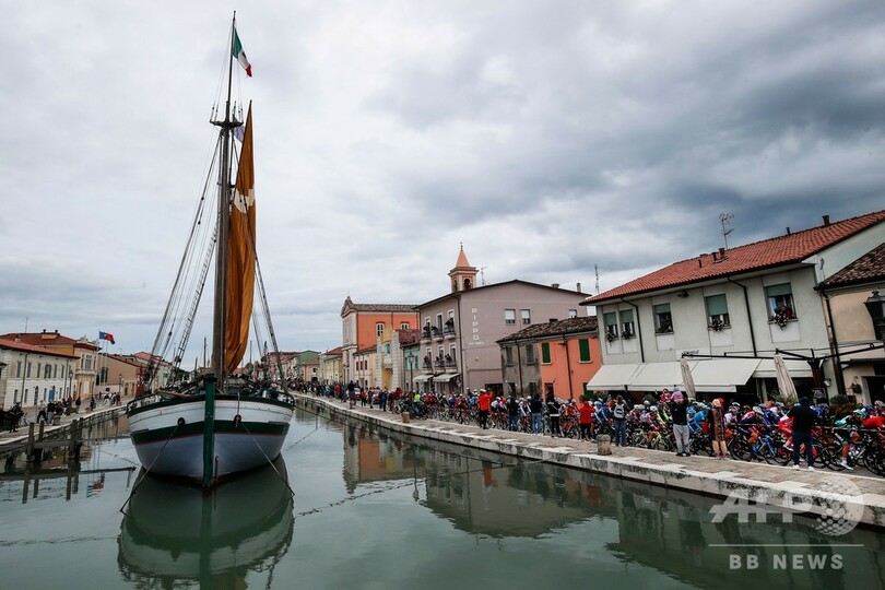 2004年に亡くなったマルコ・パンターニ(Marco Pantani)氏の故郷を回るこのステージで、ドゥクーニンク・クイックステップ(Deceuninck Quick Step)のジョアン・アルメイダ(Joao Almeida、ポルトガル)は、総合首位のマリア・ローザ(ピンクジャージー)を守った。アルメイダや総合首位を争う有力選手は、ナルバエスから約8分以上遅れてフィニッシュした。(c)AFP