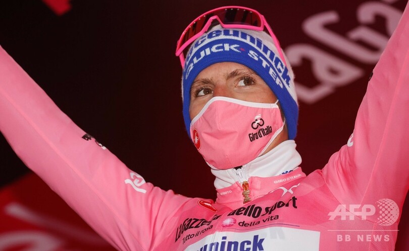 2004年に亡くなったマルコ・パンターニ(Marco Pantani)氏の故郷を回るこのステージで、ドゥクーニンク・クイックステップ(Deceuninck Quick Step)のジョアン・アルメイダ(Joao Almeida、ポルトガル)は、総合首位のマリア・ローザ(ピンクジャージー)を守った。アルメイダや総合首位を争う有力選手は、ナルバエスから約8分以上遅れてフィニッシュした。(c)AFP