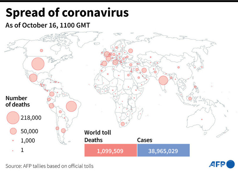【10月17日 AFP】AFPが各国当局の発表に基づき日本時間16日午後8時にまとめた統計によると、世界の新型コロナウイルスによる死者数は109万9509人に増加した。
