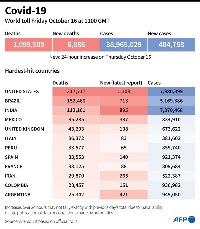 【10月17日 AFP】AFPが各国当局の発表に基づき日本時間16日午後8時にまとめた統計によると、世界の新型コロナウイルスによる死者数は109万9509人に増加した。