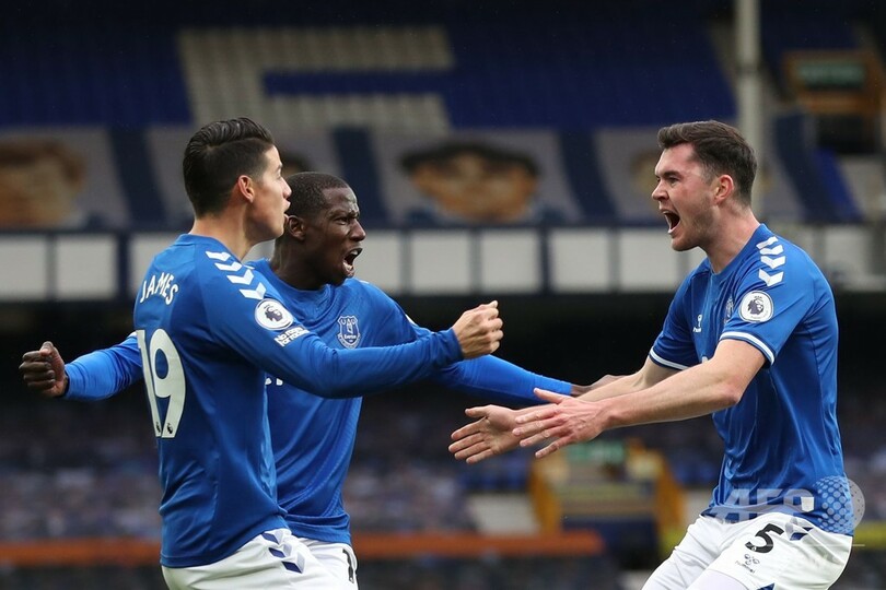 90分にエバートンは、ティアゴ・アルカンタラ(Thiago Alcantara do Nascimento)に対する危険なタックルでリシャルリソン(Richarlison)が一発退場となったものの、最後はVARにまたしても救われて勝ち点1を積み上げた。(c)AFP/John WEAVER