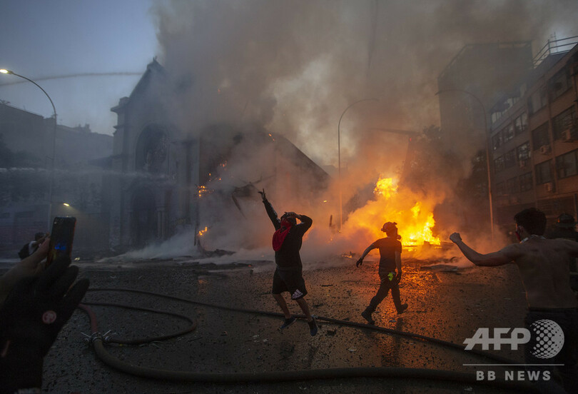 チリで抗議1周年のデモが暴徒化、放火で教会焼け落ちる