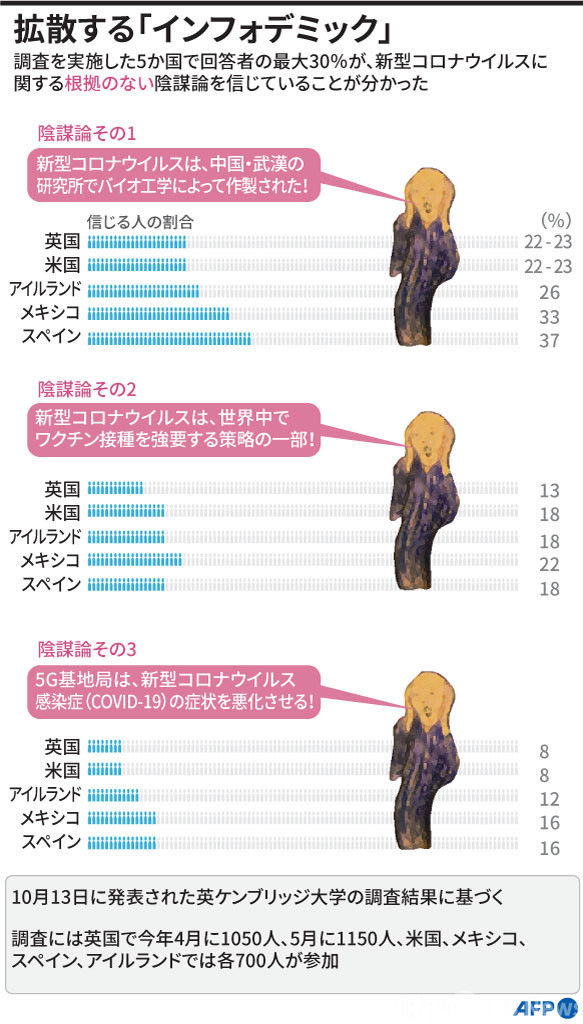 調査によると、回答者が最も信じていた陰謀論は、新型コロナウイルスは最初に流行が始まった中国・武漢(Wuhan)の研究所で故意に作製されたという説だった。この主張を「信用できる」と判断した回答者は、米国と英国では22~23%、メキシコでは33%、スペインでは37%だった。