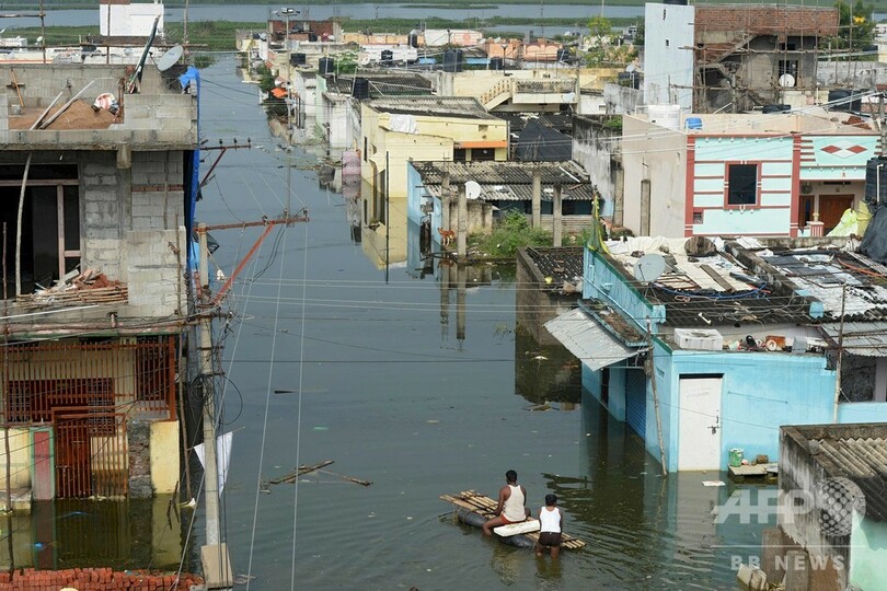 【10月20日 AFP】インド南部ハイデラバード(Hyderabad)郊外の豪雨による洪水の被害を受けた住宅街で20日、屋根の上で立ち往生する犬や、いかだに乗って家財道具を探す住民の姿が見られた。(c)AFP