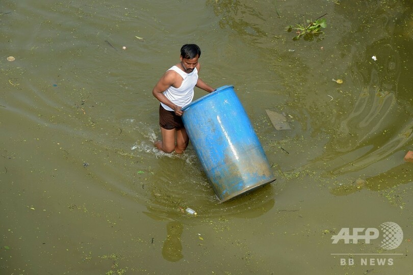 【10月20日 AFP】インド南部ハイデラバード(Hyderabad)郊外の豪雨による洪水の被害を受けた住宅街で20日、屋根の上で立ち往生する犬や、いかだに乗って家財道具を探す住民の姿が見られた。(c)AFP