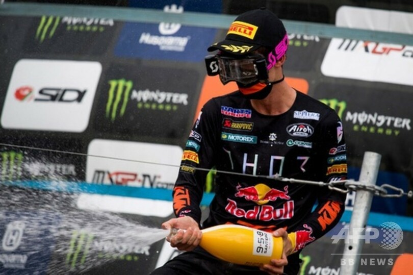 【10月28日 AFP】モトクロス世界選手権(Motocross World Championship)第14戦で、フィニッシュラインを通過し喜ぶスペインのホルヘ・プラド・ガルシア(Jorge Prado Garcia)。ベルギー・ロンメル(Lommel)で。(c)AFP