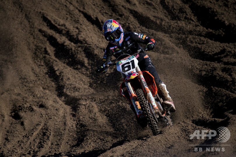 【10月28日 AFP】モトクロス世界選手権(Motocross World Championship)第14戦で、フィニッシュラインを通過し喜ぶスペインのホルヘ・プラド・ガルシア(Jorge Prado Garcia)。ベルギー・ロンメル(Lommel)で。(c)AFP