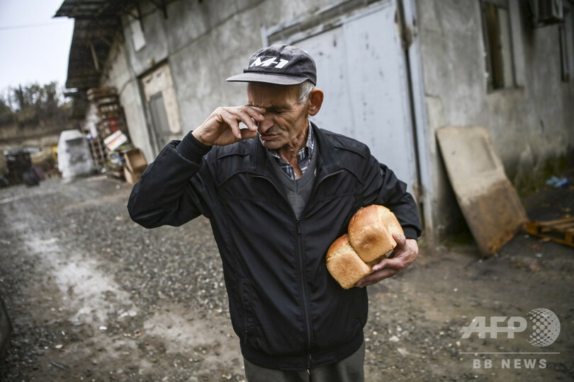 【11月1日 AFP】アルメニアとアゼルバイジャンの係争地ナゴルノカラバフ(Nagorno-Karabakh)をめぐる戦闘が続く中、主要都市のステパナケルト(Stepanakert)のベーカリーから無料のパンを受け取る高齢男性。