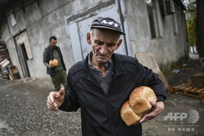 【11月1日 AFP】アルメニアとアゼルバイジャンの係争地ナゴルノカラバフ(Nagorno-Karabakh)をめぐる戦闘が続く中、主要都市のステパナケルト(Stepanakert)のベーカリーから無料のパンを受け取る高齢男性。