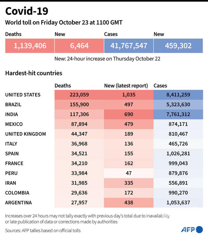 【10月24日 AFP】AFPが各国当局の発表に基づき日本時間23日午後8時にまとめた統計によると、世界の新型コロナウイルスによる死者数は113万9406人に増加した。