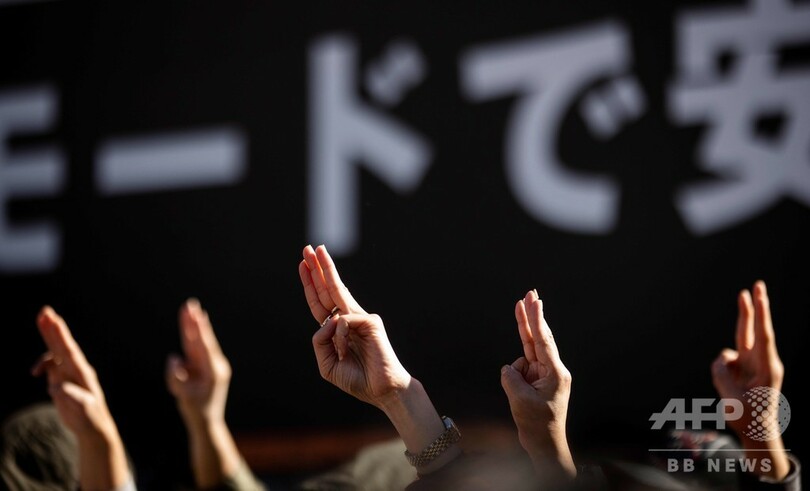 【10月25日 AFP】東京都渋谷区で25日、タイの民主化運動を支持する集会が行われ、参加者らがプラユット・チャンオーチャー(Prayut Chan-O-Cha)政権への抗議の意を示す横断幕や、独裁支配からの自由を示す3本指のサインを掲げた。(c)AFP