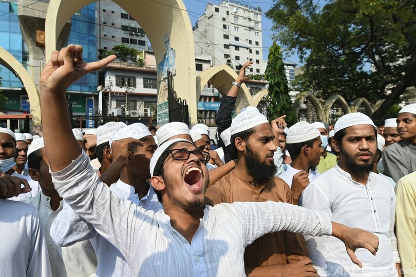 イスラム教徒が多数を占める国々では、フランスのエマニュエル・マクロン(Emmanuel Macron)大統領の発言への反発から抗議デモが相次いで発生。バングラデシュの首都ダッカと港湾都市チッタゴン(Chittagong)では今週、反フランスデモが行われ、数万人が参加した。30日の金曜礼拝後にもさらなるデモが予定されている。(c)AFP