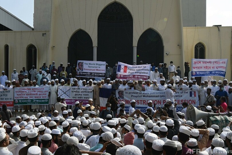 イスラム教徒が多数を占める国々では、フランスのエマニュエル・マクロン(Emmanuel Macron)大統領の発言への反発から抗議デモが相次いで発生。バングラデシュの首都ダッカと港湾都市チッタゴン(Chittagong)では今週、反フランスデモが行われ、数万人が参加した。30日の金曜礼拝後にもさらなるデモが予定されている。(c)AFP