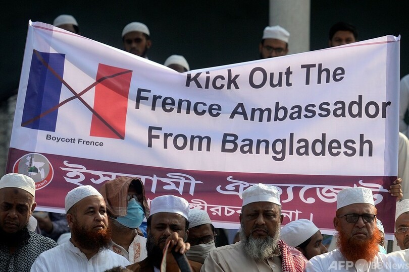 イスラム教徒が多数を占める国々では、フランスのエマニュエル・マクロン(Emmanuel Macron)大統領の発言への反発から抗議デモが相次いで発生。バングラデシュの首都ダッカと港湾都市チッタゴン(Chittagong)では今週、反フランスデモが行われ、数万人が参加した。30日の金曜礼拝後にもさらなるデモが予定されている。(c)AFP