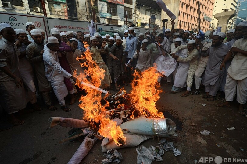 イスラム教徒が多数を占める国々では、フランスのエマニュエル・マクロン(Emmanuel Macron)大統領の発言への反発から抗議デモが相次いで発生。バングラデシュの首都ダッカと港湾都市チッタゴン(Chittagong)では今週、反フランスデモが行われ、数万人が参加した。30日の金曜礼拝後にもさらなるデモが予定されている。(c)AFP