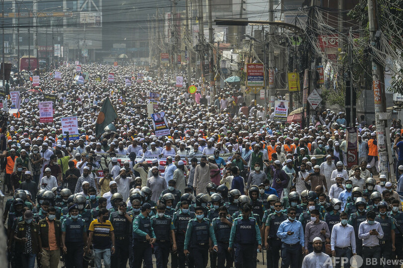 イスラム教徒が多数を占める国々では、フランスのエマニュエル・マクロン(Emmanuel Macron)大統領の発言への反発から抗議デモが相次いで発生。バングラデシュの首都ダッカと港湾都市チッタゴン(Chittagong)では今週、反フランスデモが行われ、数万人が参加した。30日の金曜礼拝後にもさらなるデモが予定されている。(c)AFP