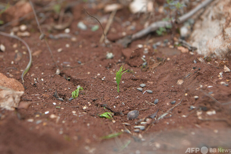 黒山山麓の実験エリアでは苗木の成長を確認すると同時に、苗木の出現率が低いエリアで再び散布作業を行っている。今後は実験を生かし、省内で大規模な空中植林作業に取り組む。(c)CNS/JCM/AFPBB News
