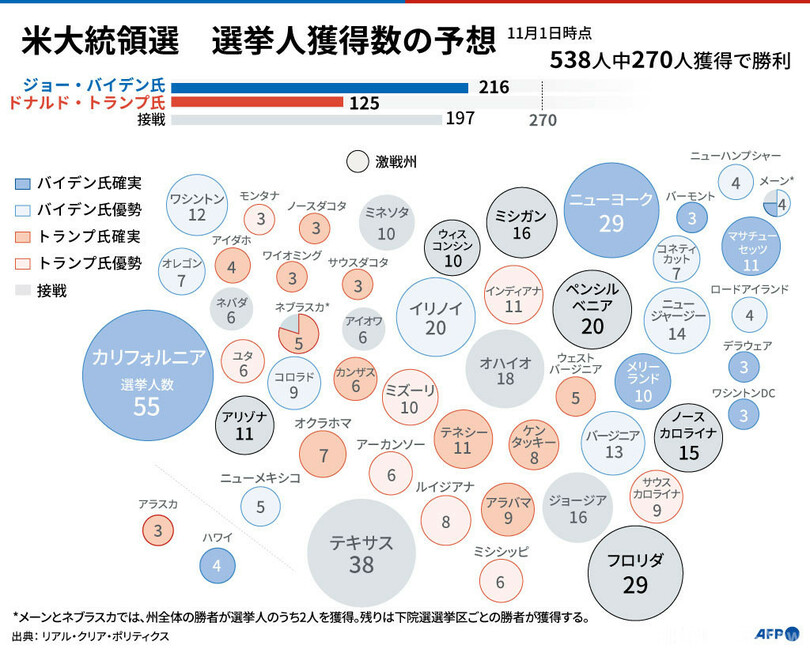 【11月1日 AFP】3日に投票が行われる米大統領選挙で、民主党のジョー・バイデン(Joe Biden)候補が共和党の現職ドナルド・トランプ(Donald Trump)氏から政権を奪うためには、激戦区の数州を制す必要がある。