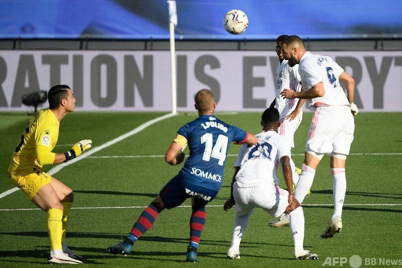 その後レアルはカリム・ベンゼマ(Karim Benzema)とフェデリコ・バルベルデ(Federico Valverde)のゴールで勝利を決定づけると、ウエスカのダビド・フェレイロ(David Ferreiro)に1点を返されたが、後半アディショナルタイムにはベンゼマがこの日自身2点目、チーム4点目となるゴールを決めて突き放した。(c)AFP/Thomas ALLNUTT