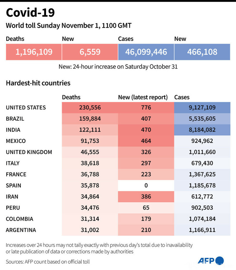 【11月2日 AFP】AFPが各国当局の発表に基づき日本時間1日午後8時にまとめた統計によると、世界の新型コロナウイルスによる死者数は119万6109人に増加した。