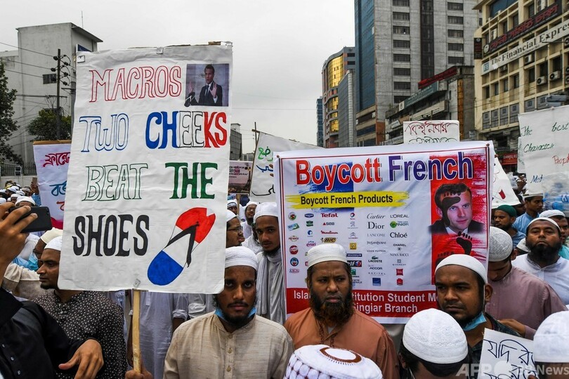 デモ参加者らは、「預言者ムハンマドの冒涜(ぼうとく)は認めない」と叫び、マクロン氏の人形を燃やすなどした。